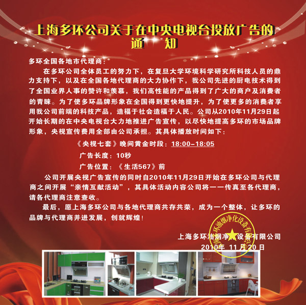 上海多環(huán)公司關(guān)于在中央電視臺(tái)投放廣告的通知
